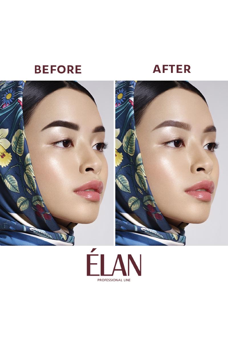 Fargekorreksjon. For å fjerne det akkumulerte syntetiske fargestoffet kun fra øyenbrynshårene og bevare fargen på huden, påfør Argan Oil Skin Protector fra ÉLAN på huden rundt øyenbrynene. Bruk den profesjonelle sminkebørsten BLACKWOOD #1 fra ELAN.