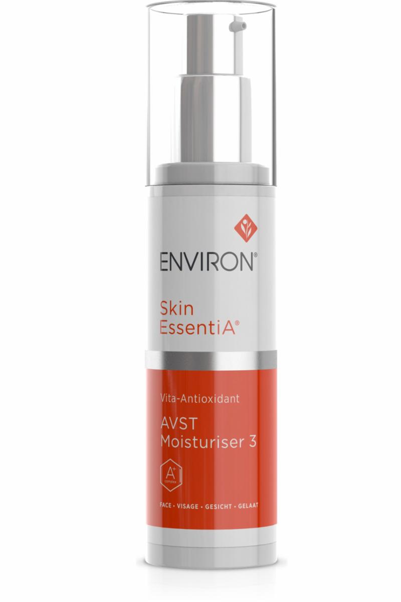 AVST3 er den tredje vitamin-A-fuktighetskremen i Step-up-systemet til Environ. Den inneholder en moderat til høy konsentrasjon av vitamin A (Retinyl Palmitat), i tillegg til vitamin C og antioksidanter, som hjelper å normalisere og forbedre hudens naturlige fuktighetsnivå. Fuktighetskremen forbedrer utseendet på fine linjer i huden, gir jevnere hudtone, reduserer aldringstegn og synlig solskade.