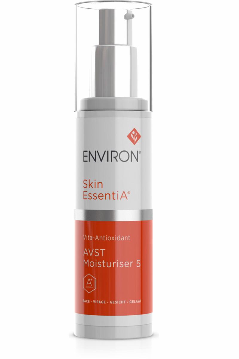 AVST5 er den femte og siste vitamin-A-fuktighetskremen i Step-up-systemet til Environ. Den inneholder den høyeste konsentrasjonen av vitamin A (Retinyl Palmitat), i tillegg til vitamin C og antioksidanter, som hjelper å normalisere og forbedre hudens naturlige fuktighetsnivå. Fuktighetskremen forbedrer utseendet på fine linjer i huden, gir jevnere hudtone, reduserer aldringstegn og synlig solskade.