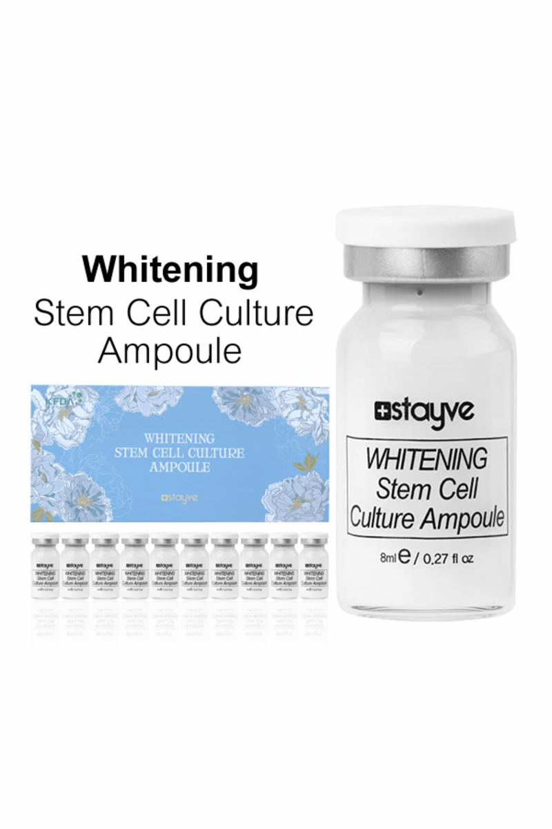 Stayve Whitening Stem Cell Culture Ampuller inneholder forskjellige plantestamcellekulturer, peptider, adenosin og niacinamid som gir rynkereduksjon og lysnende effekt og forbedrer elastisiteten og hjelper til med å glatte huden.