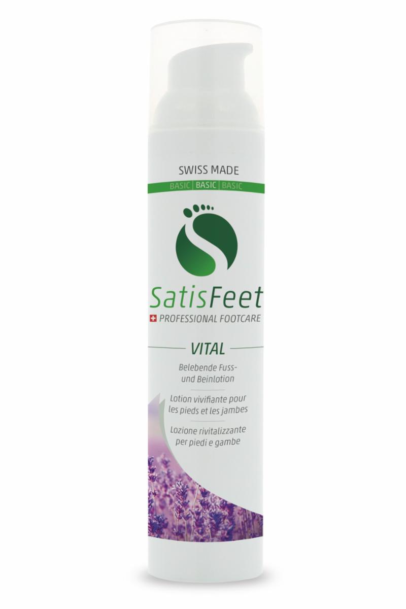 Beroligende fot og legg-lotion som trekker raskt inn og gir vitaliserte og myke ben. SatisFeet Vital passer bra for deg som står og går masse, og som opplever uro i bena. Lavendelolje fra “Mont Blanc”, gir huden et løft av vitalitet, fukt og næring.